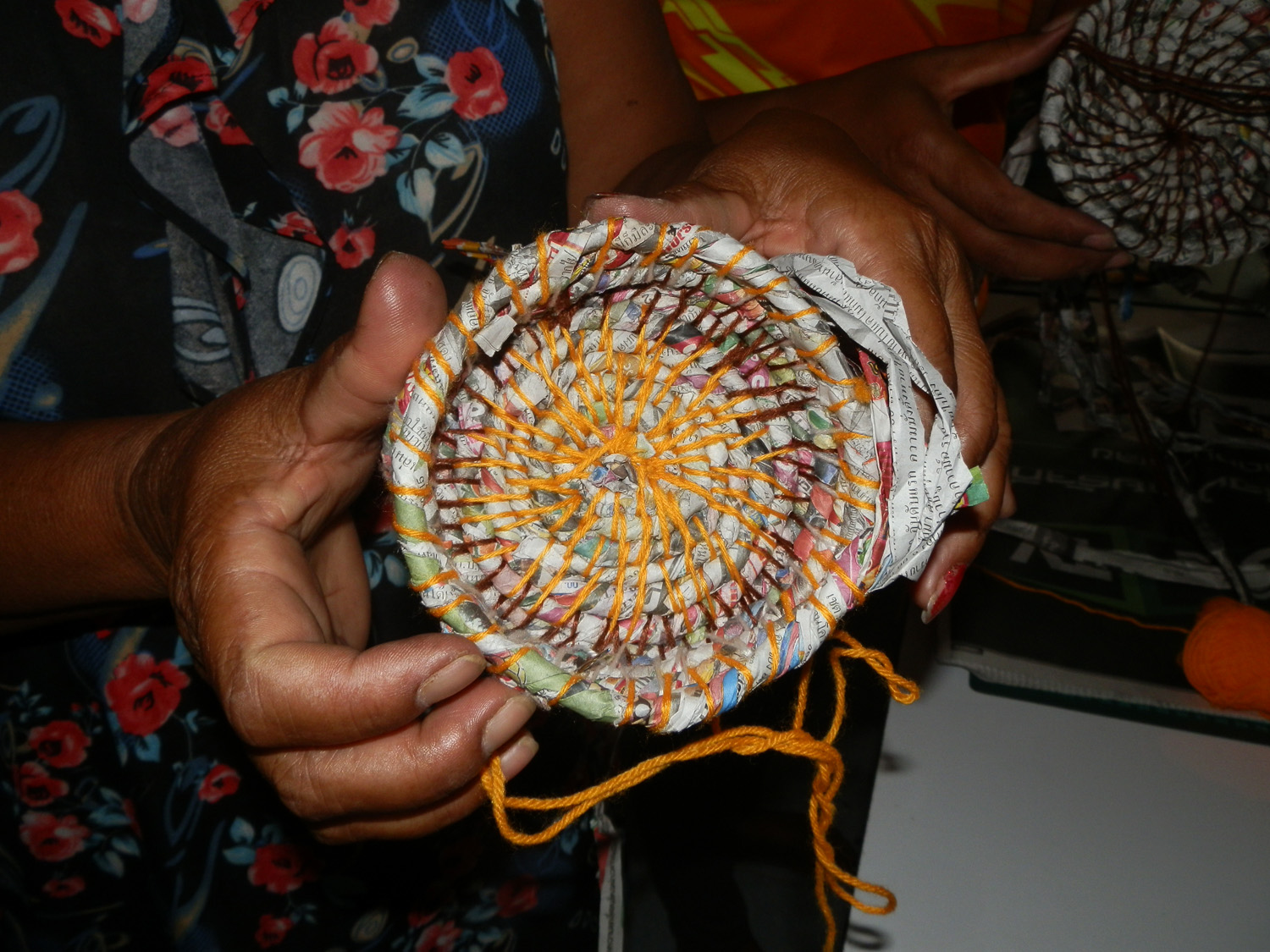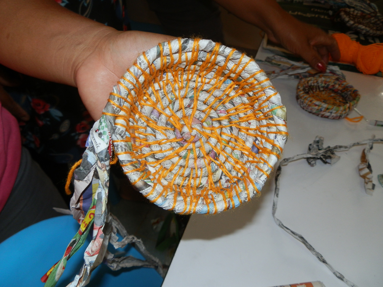 They are a talented group and caught on very quickly. We communicated with hand signals and practical demonstrations, which overcome the language barrier well. With eight participants we were able to fit around one table. We also had two others calling in for just a couple of hours in the afternoon. All but the two participants who arrived later had basket forms made by the end of the day. They all took needles, thread and paper home to keep working on them in their own time. I will show them how to finish off and demonstrate some variations in technique next time.
