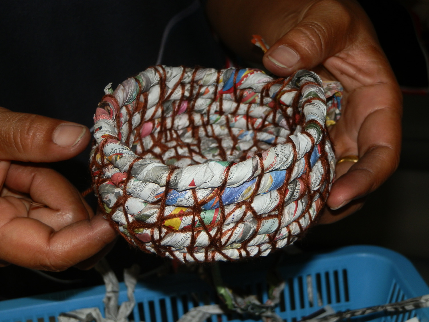 I noticed that they had brought newspapers not the silver backed packets we needed for the workshop. On was not with the ladies; none of the others speak any English and I spoke no Thai. I called Art to come and translate for me. I showed them the paper belt and one I had partially made with silver packets. I explained that newspaper was not suitable to make belts.