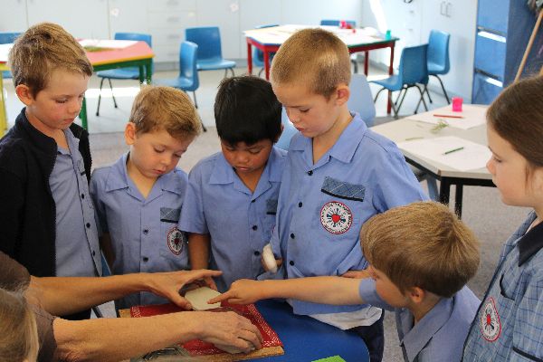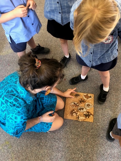 St Joseph’s Primary School in Barcaldine hosted Flying Arts facilitator Nancy Brown for a series of workshops connecting arts with school curriculum. Forty two students from Prep to Year 6, seven school staff and one keen community member worked together to produce a series of tiles to be displayed in a cabinet at the school entrance.