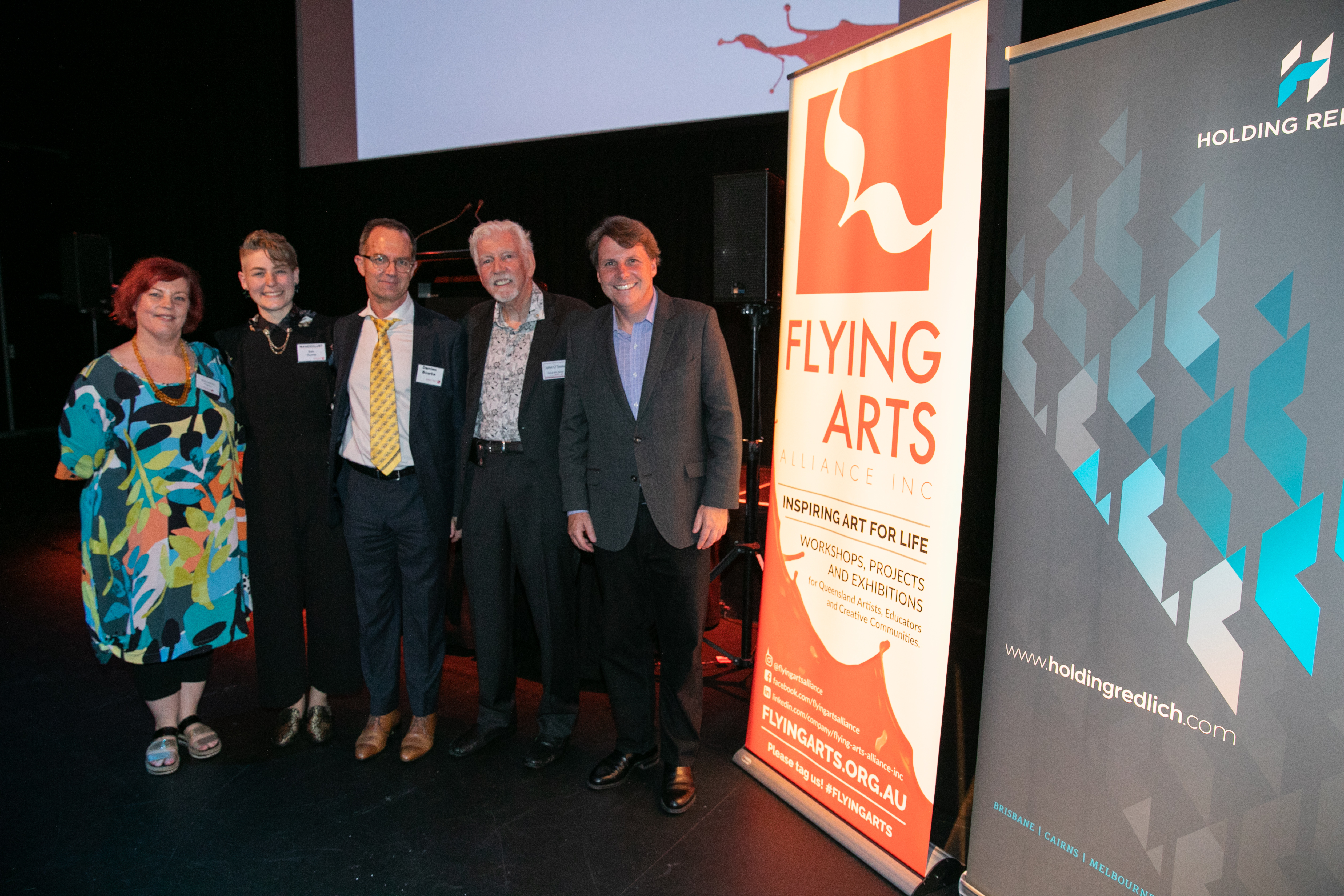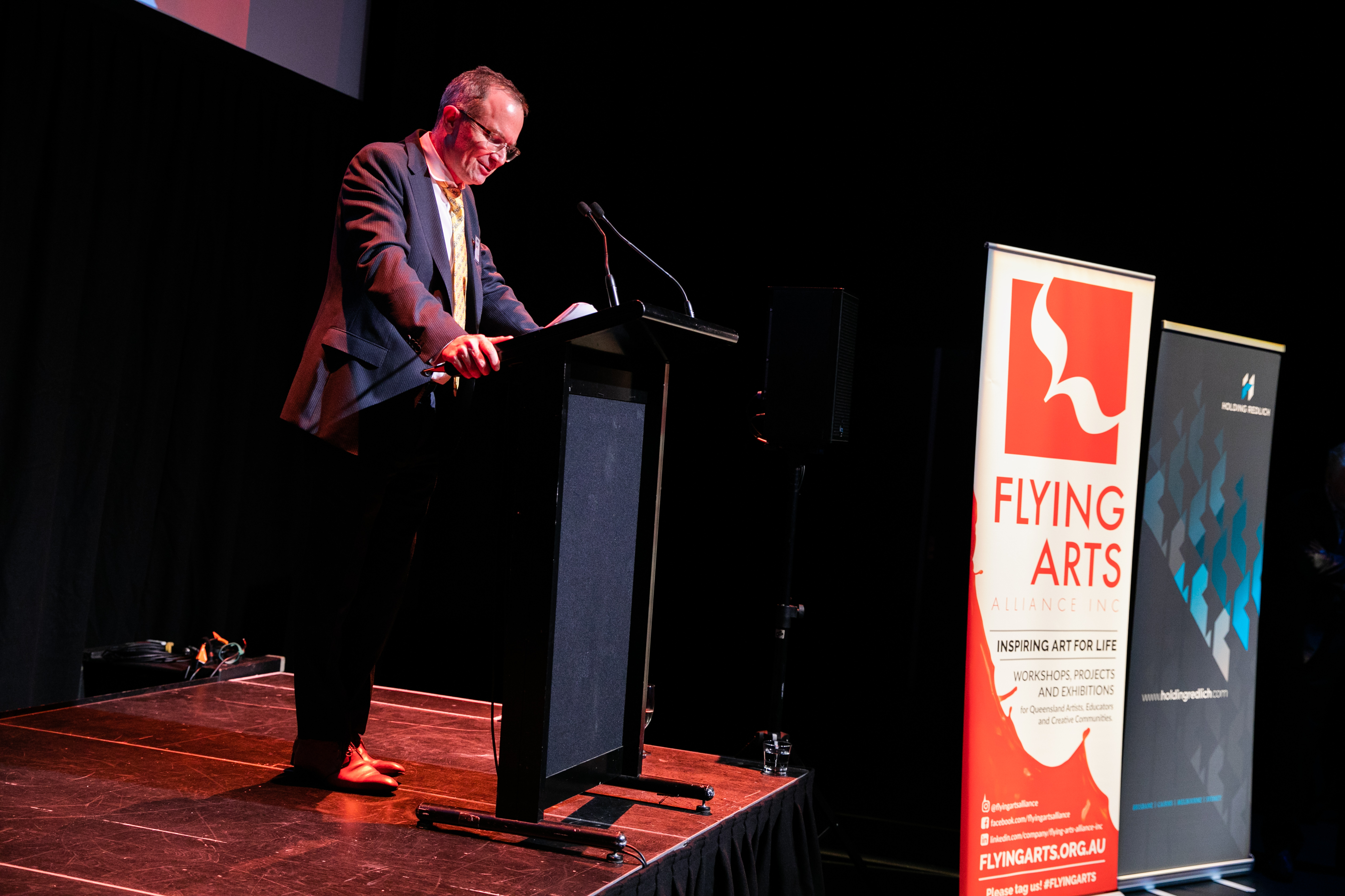 Thanks Damien. And just as sincere thanks to all the other equally generous and faithful donors of this year’s prizes – many of them are here, this is audience participation time, and they are all worth a clap, please: The Geoff Booth Foundation, David Crombie Family Trust, Jane de Boer, Ironlak, State Library of Queensland The Edge, The Johnson Art Series Hotel, USQ Artsworx, and all our own family with big hearts and deep pockets, the Flying Arts 500 Club. And a final big hand for the curators, Bruce, Bianca and Renai.