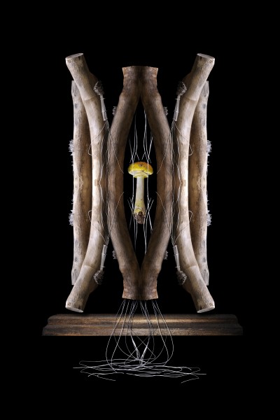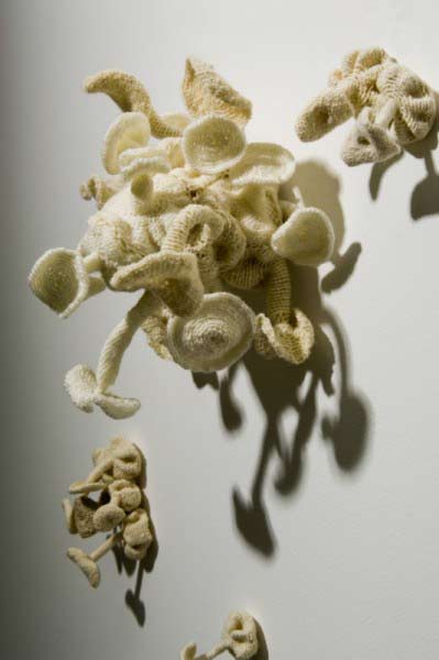 ‘Entwined III’ explores ecological systems as vibrant, interconnected and sublime living networks that support, encourage and sustain new growth. Suspended above the surface, the trunk like forms have an intricate network of threads entwined within and around, above and below, surrounding, protecting and nurturing the young fungi inside. In nature there is a beautiful balance between function and aesthetics, where healthy ecosystems bring about new life and with it wonder and opportunities. It is easy to draw parallels between natural and social ecologies: Similar to the unseen root systems of plants and fungi, our interactions in and with our own community help to sustain a vibrant, healthy and colourful place to live, grow and bloom.