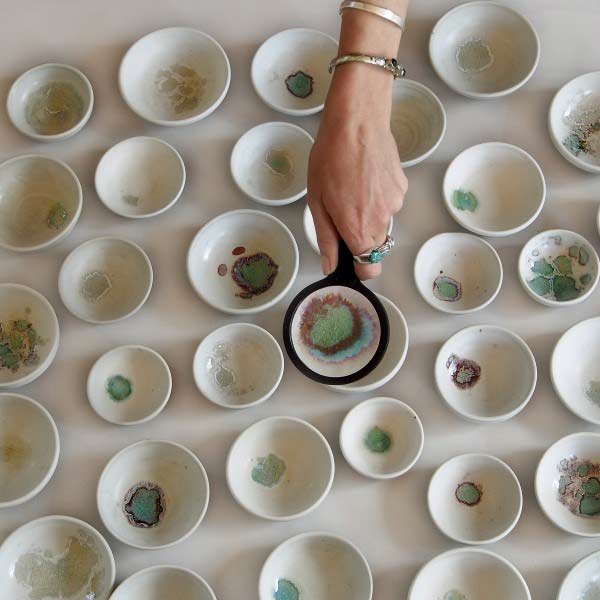Experimenting with new glazes means examining the subtleties of the glazed surface. I undertake the fascinating task of observing the changes in behaviour of the glazes depending on the atmosphere in the kiln and other variables. I analyse the surface down to the millimetre. It’s those tiny layers and specks that reveal the next amazing process to pursue. I am constantly reminded to examine another surface regularly and thoroughly, checking for minute changes, observing the tiny specks and textures – my skin. Recently several friends and family have dealt with the ordeal of Melanoma. As Australians this is a serious reality. I invite you to participate in glaze examination with ‘Millinoma’. Meticulously observe the details, look deeply and enjoy the process. I encourage you to return home, repeat the process with the surface of your own skin with the same focus and fascination. Be aware of the vital signs.