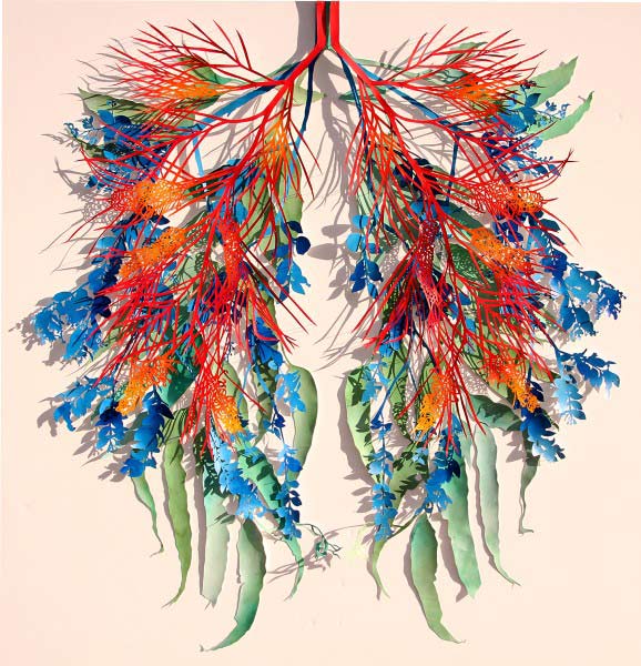 This artwork addresses the precarious and complex relationships humans experience with our natural environment and resources. It honours my deep connection to the Australian bush (having spent many years living in regional Queensland) and the healing power of the breath. The work also comments on the interconnectedness of humans to the environment, our consciousness and impact upon it. Humans are destroying the living support system for our planet through climate change — we are suffocating the very thing that we depend on for survival. I have created a respiratory system from drawings of local flora located within 10km of my home. These drawings were meticulously hand cut and colored then pinned to reference specimens found in a museum. Through the making of this work I am forced to slow down and reflect upon the importance of nature for my existence. I breathe in life and breathe out life.