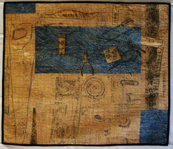 I am a textile and mixed media artist living on the edge of the Scenic Rim (Tarome). I have been a quilter since 1987. Through the language of textiles and thread I create art quilts and textile works that explore the nature of relationships and change. I create fabric pieces, building change through layers of texture using dyes, rubbing with oil based pigments, overprinting with textile paints and machine stitching. My Father’s Shed explores feelings of grief, loss and the experience of monumental change when moving after forty years of him working in his sacred space and place. Creating the quilt required acceptance of change – the process of printing tools, tins, nails – his lifetime of collecting those things that might one day be useful, abruptly discarded in the metamorphosis. My Father’s Shed is layered and stitched with the memory of living change.