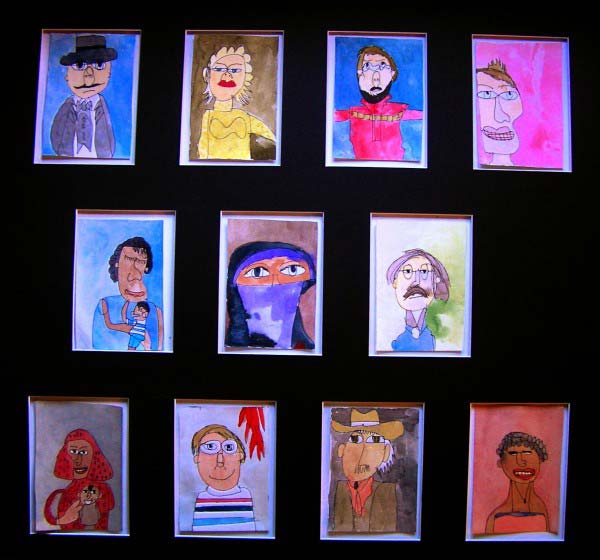 This art work is called “Small Faces : Obsessions” it is a series of small portraits of actors or characters who are from either TV or Movies. The portraits were painted on one sheet of paper but will be separated when framed. The portraits display Luke’s major obsession with TV and movies and has been a huge influence on his life since he was 3 years old. The TV screen has been Luke’s connection with the outside world and has taught him how to talk and read and eventually communicate with other people. Obsession is a major part of autism and Luke has used these obsessions to help him in his everyday life. The characters help him to connect to real people and places and have helped him to become an artist who relishes people admiring and talking about his art.