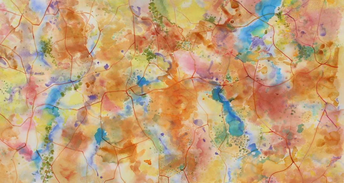 Capturing the essence of this broad landscape seems a natural progression, having painted the Queensland landscape for so many years. The abstract shapes overlaid with colour create a rugged textural quality, as colours can change drastically with the seasons, from a dry red/ ochre to lush greens. Watercolours fluidity and transparency combined with its tendency to flow in a slightly uncontrolled manner can be an asset in creating the surface of the land and emphasis its abstract quality. I sketch the interlocking lines from maps until I have a grided pattern. Overlaying with splashes of colour letting it run freely blending into their own shapes, I pick up linear shapes and reinforce them in other areas. Structured lines represent the human interaction, etched into the landscape surface, both connecting and separating the spaces, the ‘roads’ sometime faint and often vibrant foretell the tangibility of marks that time will eventually obliterate.