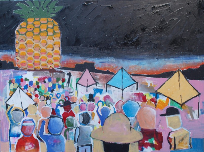 My piece, titled “Pineapple Music” pays homage to one of the biggest festivals in my region. The big pineapple festival is a congregation of people from all different life backgrounds celebrating a common interest of music. The festival gives off a somewhat relaxed vibe which has tried to be conveyed through the style of this painting with the use of loose brushstrokes, simple figures and an overall abstract tone. The sense of community is heavily implied by the faceless individuals within the crowd. What is hoped to be shown from this painting is a sense of belonging which is represented by people being brought together by a common factor, in this case it is everyone looking towards the pineapple which is an icon. But overall it is is a commentary on how i see my region as a whole.