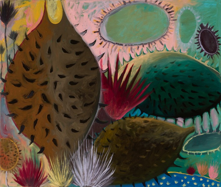 Noogooraville is a contemporary landscape painting that investigates the Noogoora burr, a weed of central Western Queensland. Specimens for this painting were observed and collected in Winton. The unusual colour palette is atypical for an Australian landscape in order to understand the burrs status as a foreigner. The ‘Noogoora’ burr was accidentally introduced to this land from Central America in the late nineteenth-century. The carpet of strange forms is perhaps not too dissimilar to the Richard Godfrey Rivers paintings of introduced exotic trees – ‘Under the Jacaranda Tree’ (1903) and ‘An Alien in Queensland’ (Flame of the forest tree) (1904) (QAG). Noogooraville invites reward for looking. The pictorial space creates a visual dialogue depicting an abundant layering of forms in an endless space with no horizon that leaves the eye circling. Tactility of paint invites visual touch and asks for a better understanding of the deeper meaning behind the work.