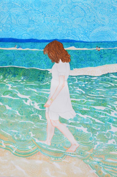 Ocean Blue To me the ‘Colours of Queensland’ is best represented by our beautiful beaches. What can be more vibrant, colourful and life-giving than our beautiful ocean? In this artwork, the ocean is comprised of symbols, and patterns in the brightly coloured blues and greens of the Pacific. This is all contrasted against the sandy coloured beach in the foreground. The sky is a vivid light blue, and the mountains in the distance are a deep cobalt. These colours, are what I think of when I imagine the colours of our Sunshine state. Inspired by a trip to Bribie, this artwork is a self portrait of me walking along the beach.