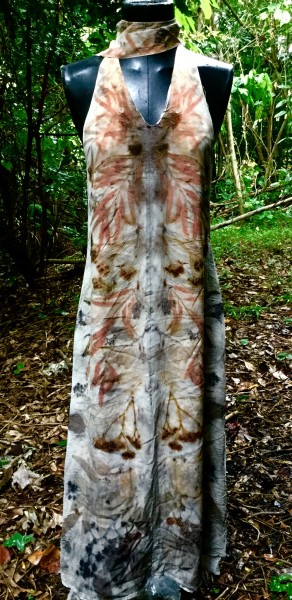 I am a Textile artist from North Queensland currently creating wearable art pieces with the Ecoprint method. This piece ‘Bush Bride’ is made using pure silk and is dyed using local native North Queensland plants. The local environment and in particular, plants are my passion. The unique forests of the Wet Tropics inspire me to create wearable art pieces capturing the essence of the Australian bush and allowing me to reconnect and blend back into my local environment. I have a background in Environmental Science and I have worked as an ethnobotanist, horticulturist and revegetator specialising in local native plants. My experiences have allowed me to get to learn about the plants personally by knowing their forms and uses. Teasing out the colours from plants to make dyed prints on textiles is my latest journey into the wonderful world of Queensland’s native plants and truly captures the colours of Queensland.
