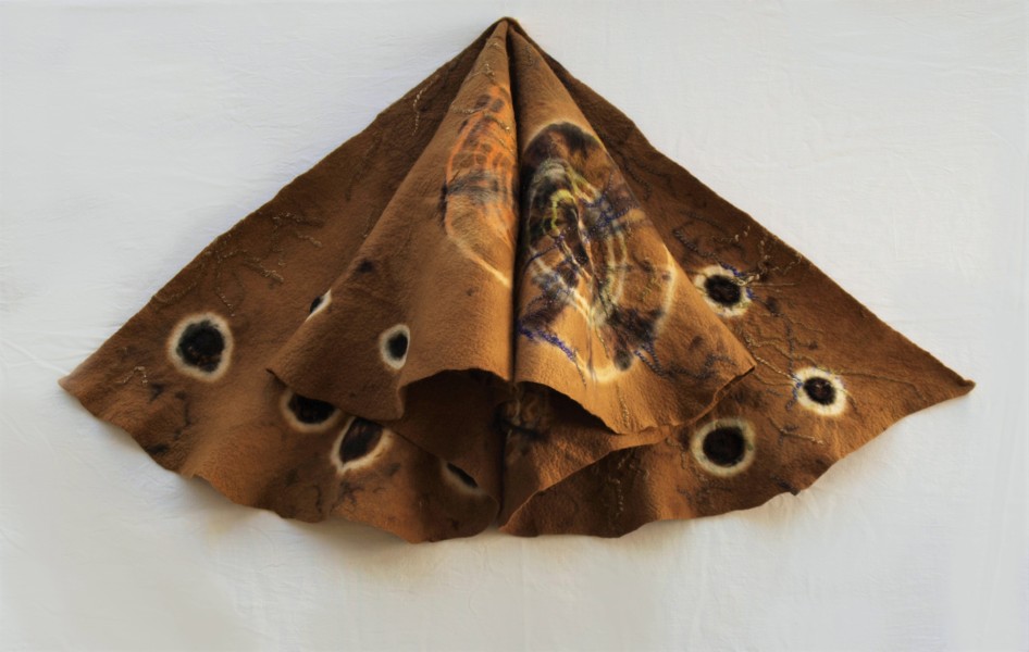 This handmade felt is a simple circular shape that surprised me when I hung it on a white wall to photograph. The piece transformed into the intrinsic notion of a moth. The textures and colours are reminiscent of the beautiful surface marks made by the scribbly gum moth on its host tree. Only a quarter of moths in the natural world have been named. It’s an unseen world and we need to respect its diversity.