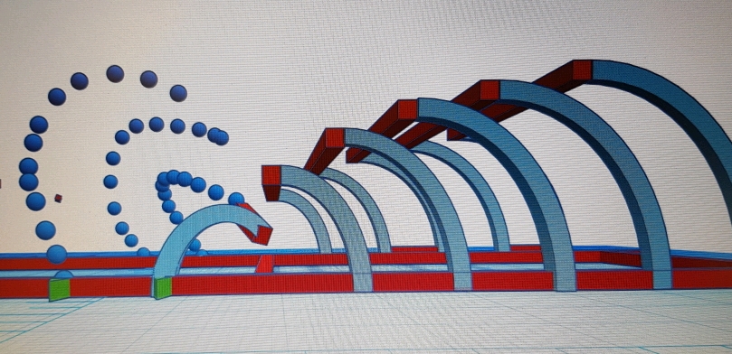 The challenge of Day 3 was to advance yesterday’s drawing so that only one side of the model had even blue curves and red bars. Overnight I hatched an idea to solve the problem of not having twists in Tinkercad – I could dot the path of the twists with a path of little spheres.