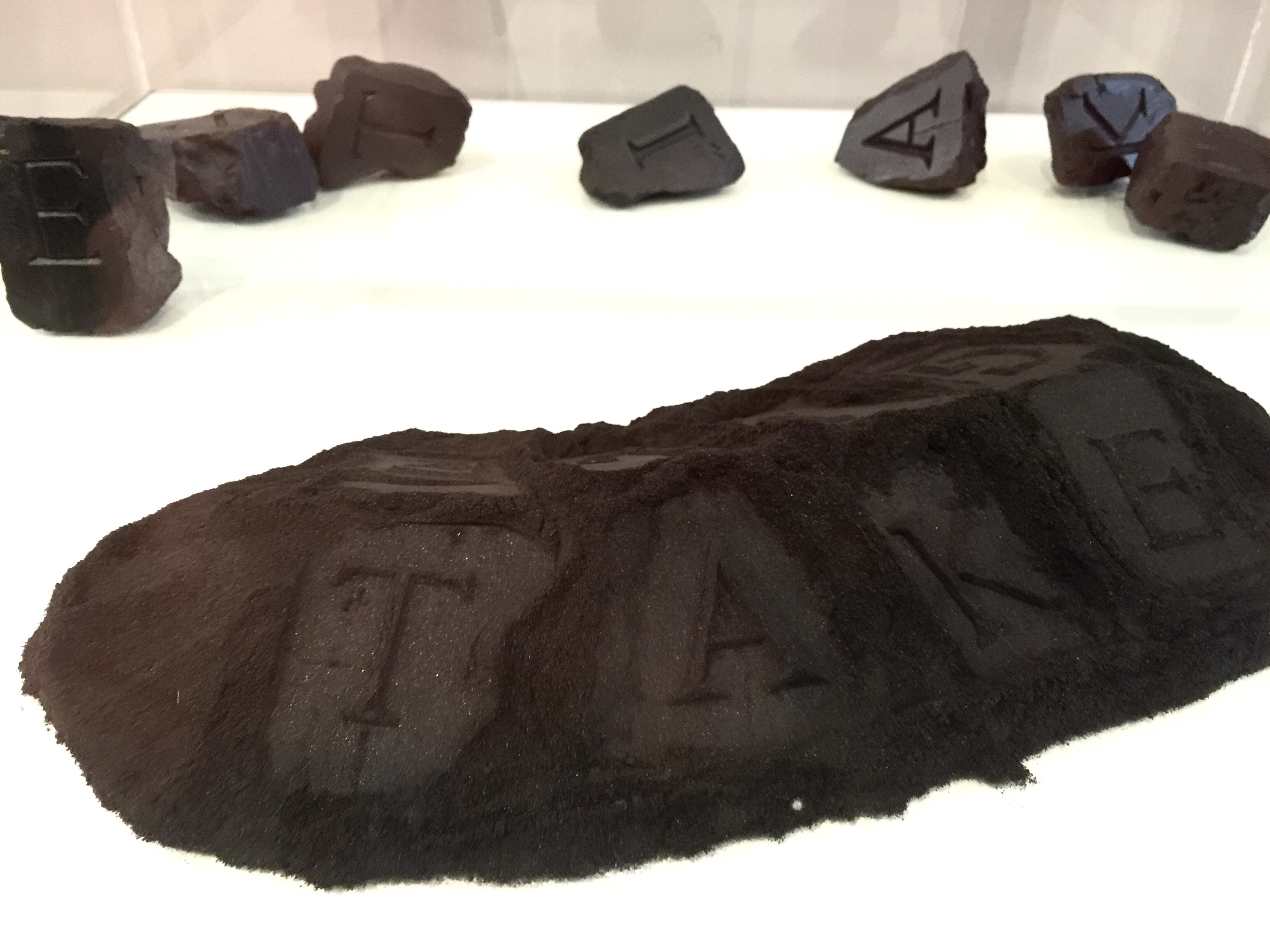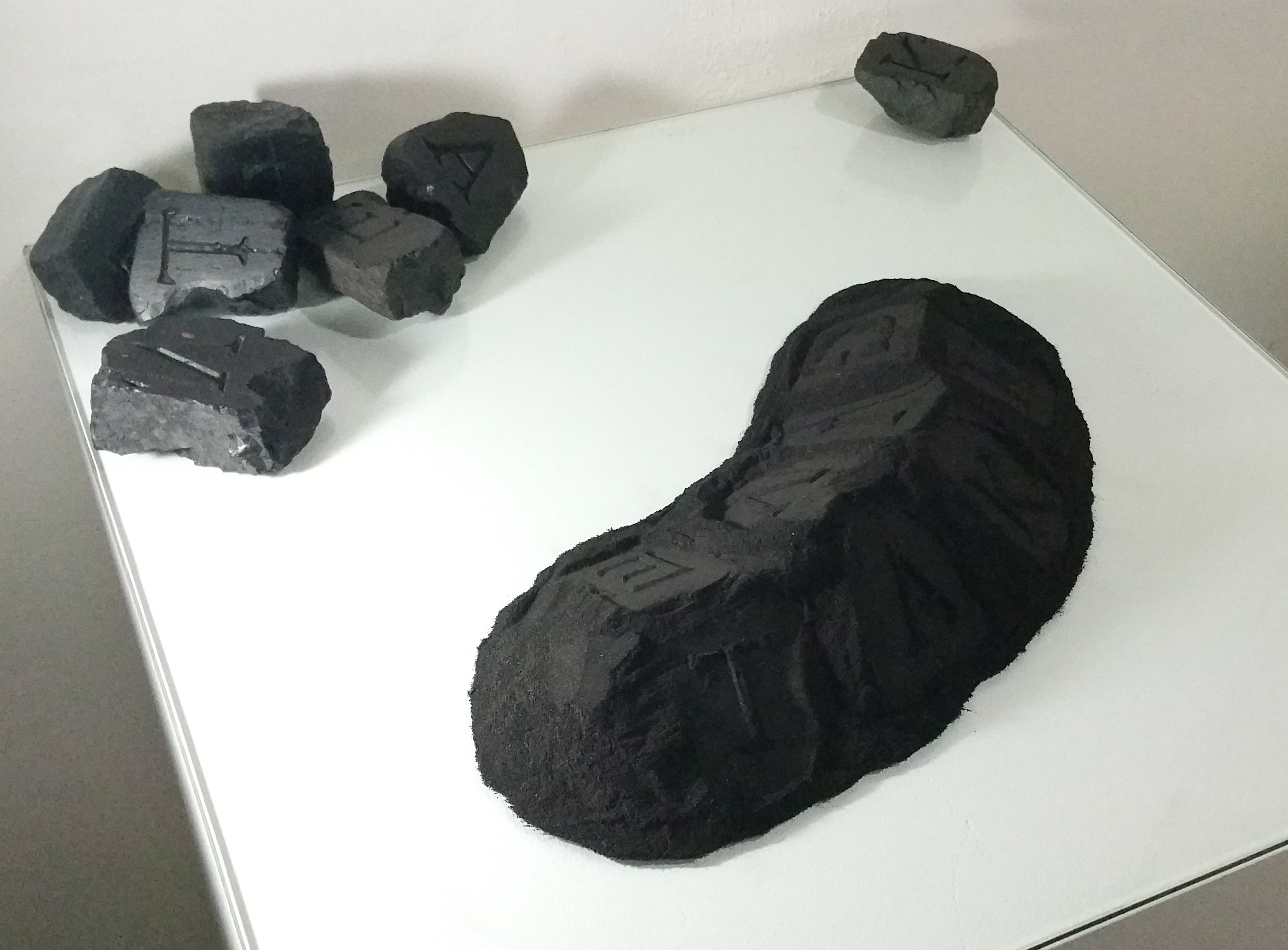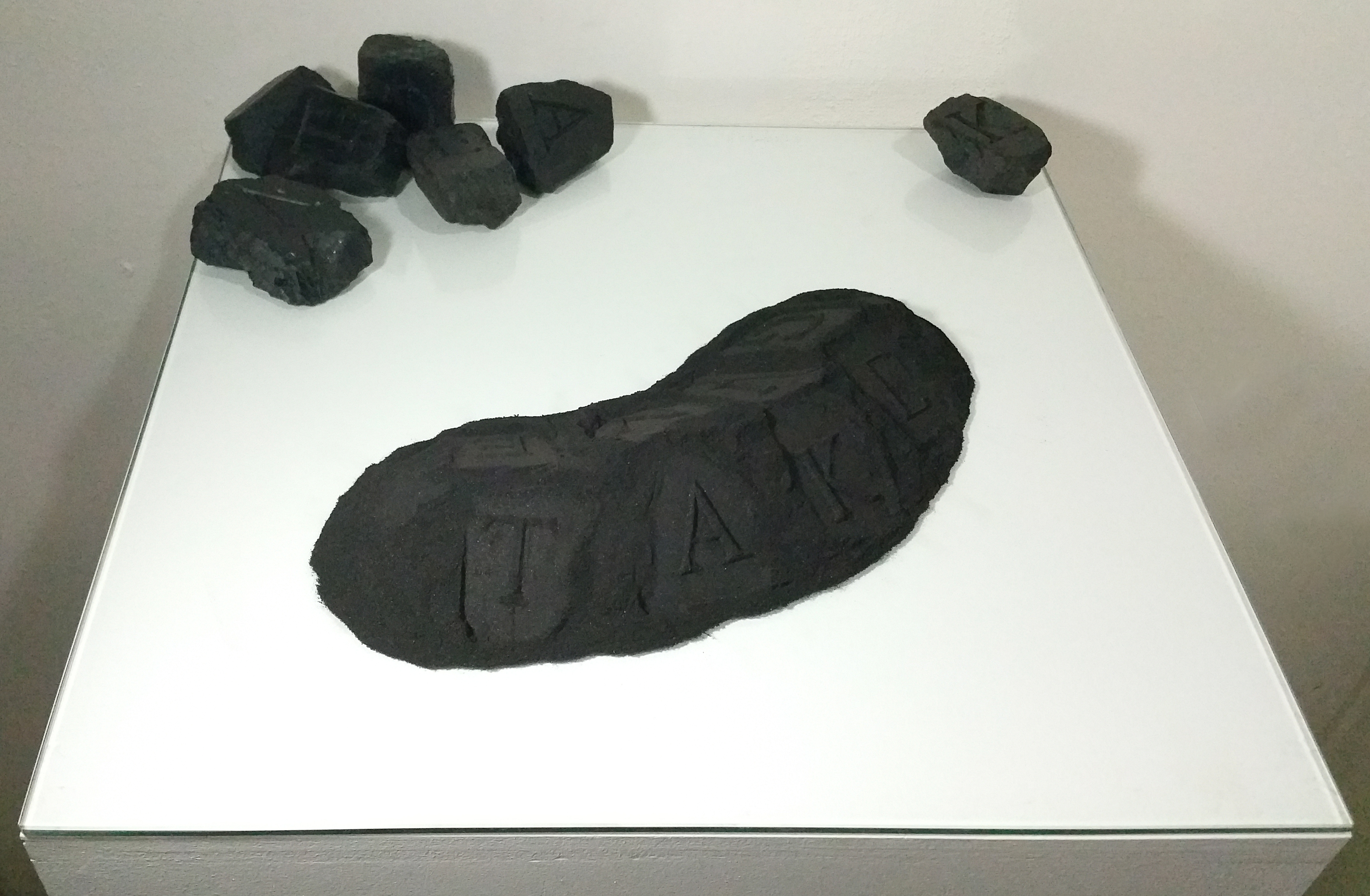 Sway is part of a larger project, Carbon Copy, where these and other carved coal letter blocks can be used to print other words in different coal dust forms to allude to other coal or related social issues. In this over-arching title, Copy, references the use of this word in print journalism.