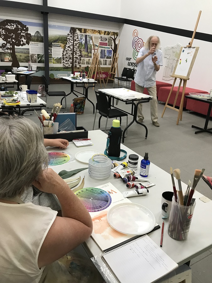 Gallery 107 concluded the showing of Colour and Response with a colour masterclass hosted by Merv Moriarty. Attendees met on the lower floor of the Gallery the a one-day intensive, learning about colour and hue in landscape and still-life painting.