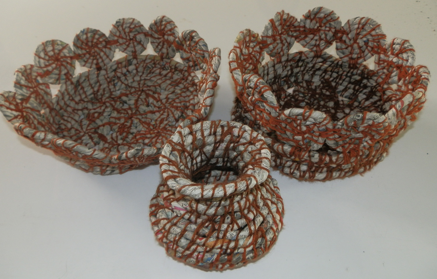In this workshop, we dipped the previously made jewelry in Shellac. We put three layers on each piece, letting them dry between layers. As each layer dried, we coiled newspaper baskets with internal loops. This was another variation on the basic coiling technique.