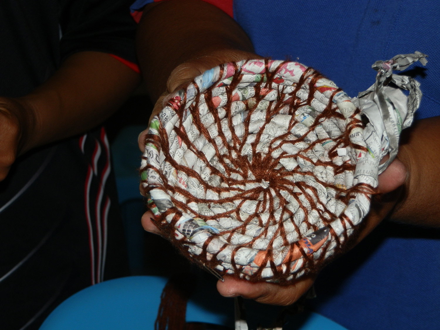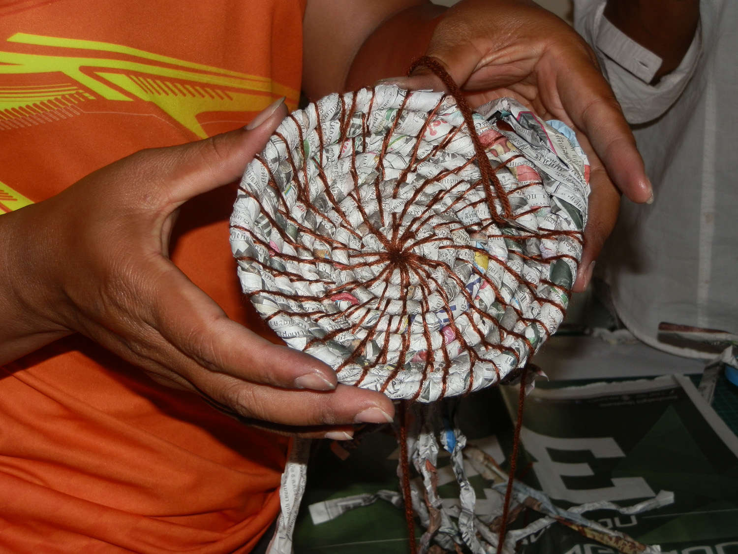 Luckily I had just finished a small coiled pot made with sales catalogues and had some strips of paper already cut and scrunched to show them. I suggested that for this workshop we used the newspapers to prepare paper for coiled bowls or pots, and they happily agreed.