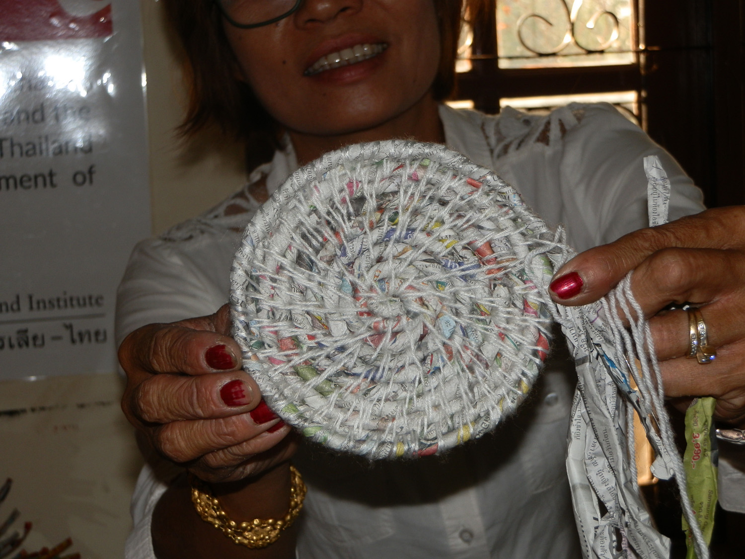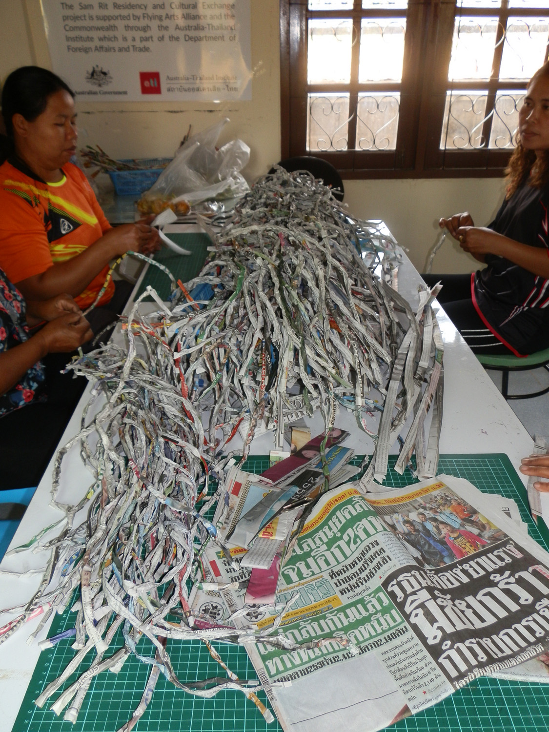 I noticed that they had brought newspapers not the silver backed packets we needed for the workshop. On was not with the ladies; none of the others speak any English and I spoke no Thai. I called Art to come and translate for me. I showed them the paper belt and one I had partially made with silver packets. I explained that newspaper was not suitable to make belts.
