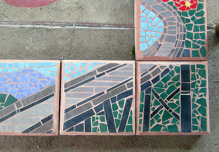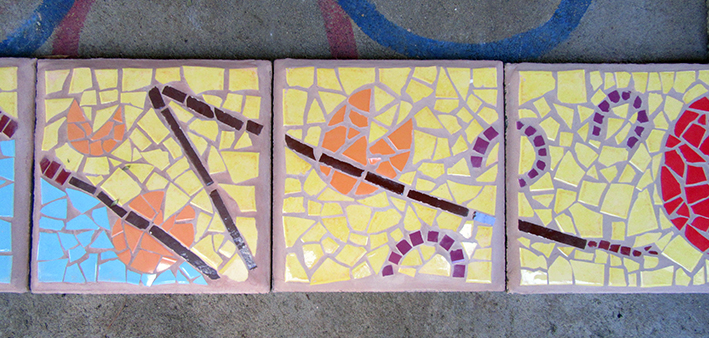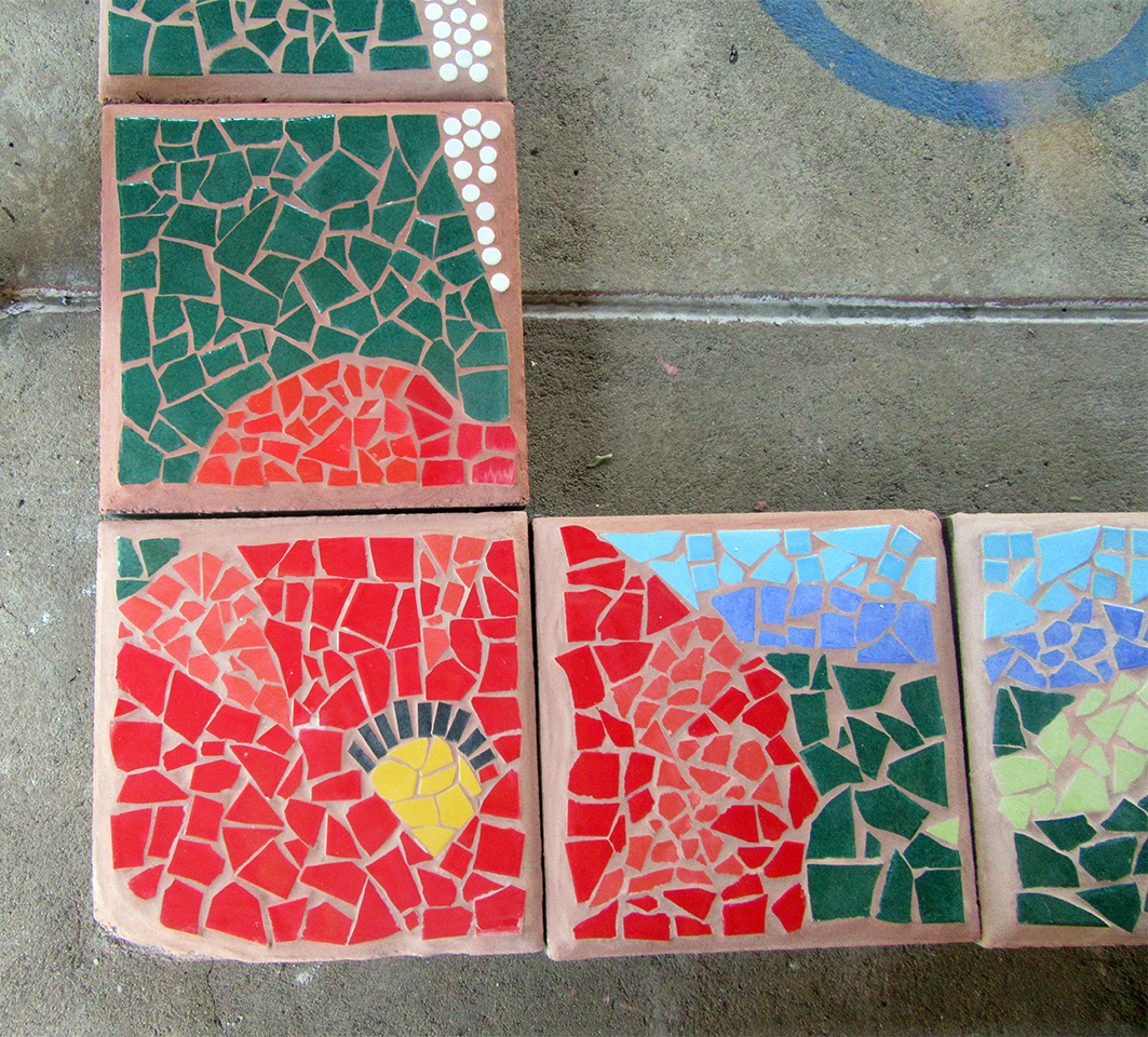 On Day 1, students were introduced to mosaics through a short PowerPoint presentation before a safety demonstration on how to use the tools. Before long, students were taking ownership of the process by experimenting with layouts. The remainder of the first day was spent tweaking the layout of the tiles on the pavers with the help of staff and community members, prepping the designs for gluing.