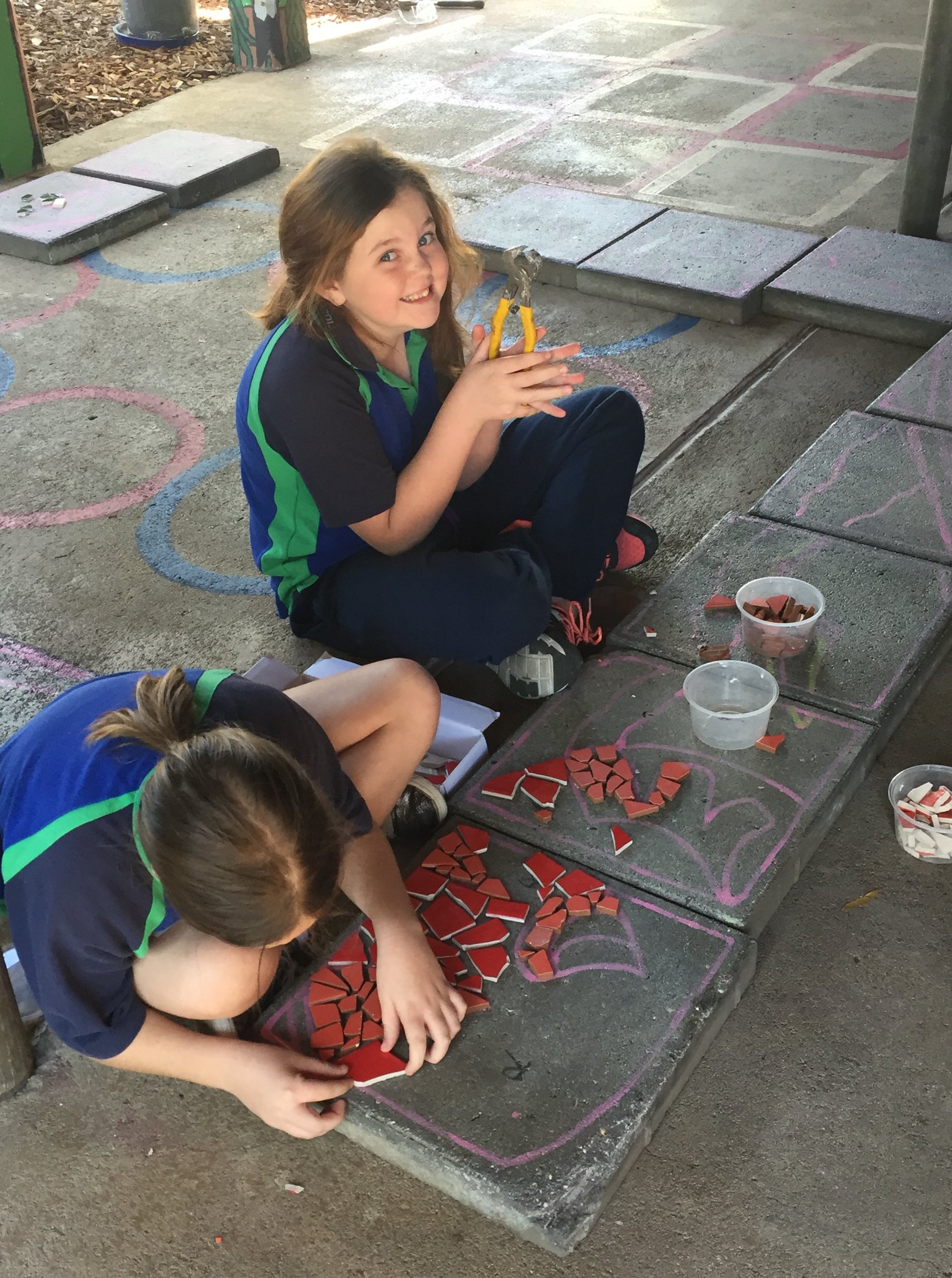 This project was a part of Flying Arts Alliance’s Small Schools Fund, which allows schools with 50 or fewer students in regional and remote Queensland to apply for a bursary of up to $5000 per school year for curriculum linked projects. In this case, students learned about their local community, industries and beautiful landscape through constructing a narrative-based mosaic.